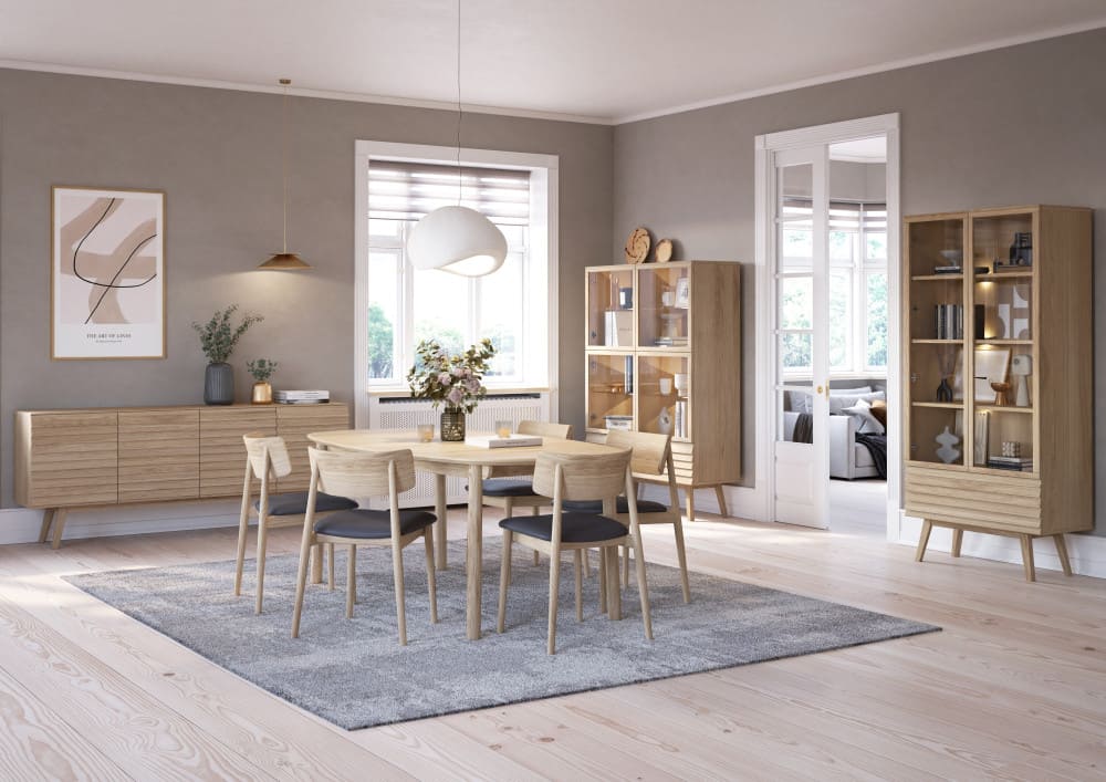La collection CASØ 777 se compose notamment d’un buffet 4 portes et 3 portes, d’une vitrine étroite , d’une grande vitrine, d’une table de repas extensible, d’un meuble tv en 150 cm, d’un meuble tv en 180 cm, ainsi qu’un meuble tv mural en 150 cm, et un plus grand en 180 cm et elle est conçue par le duo de designers danois, Steffensen & Würtz.